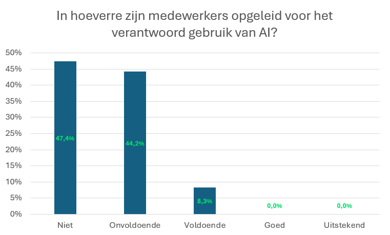 Voor dit artikel zoomen we in op de antwoorden op de vraag in hoeverre medewerkers zijn opgeleid voor het verantwoord gebruik van AI. (In een volgend artikel gaan we in op andere uitkomsten uit de peiling.)