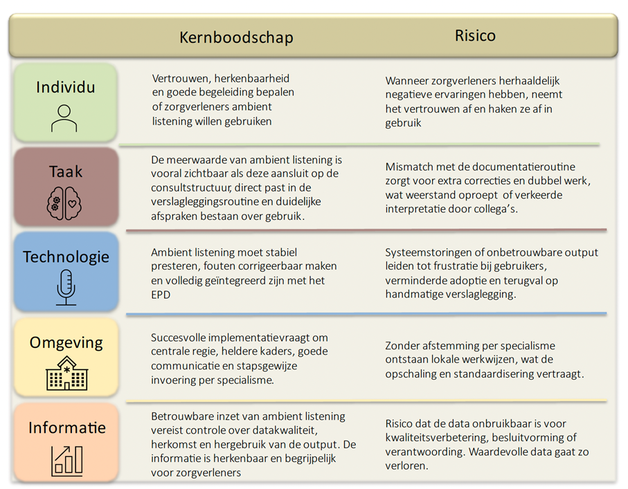 De inzet van ambient listening in het Radboudumc liet zien dat het bij de juiste inzet kan leiden tot concrete meerwaarde: meer rust in het gesprek, betere consultkwaliteit en, in sommige gevallen, tot wel een uur tijdwinst per dag. Deze opbrengsten waren vooral zichtbaar bij lange en/of complexe gesprekken. Tegelijkertijd werd duidelijk dat de effectiviteit sterk afhangt van het type consult en de bestaande verslagstructuur: niet in elke situatie voegde de technologie waarde toe.